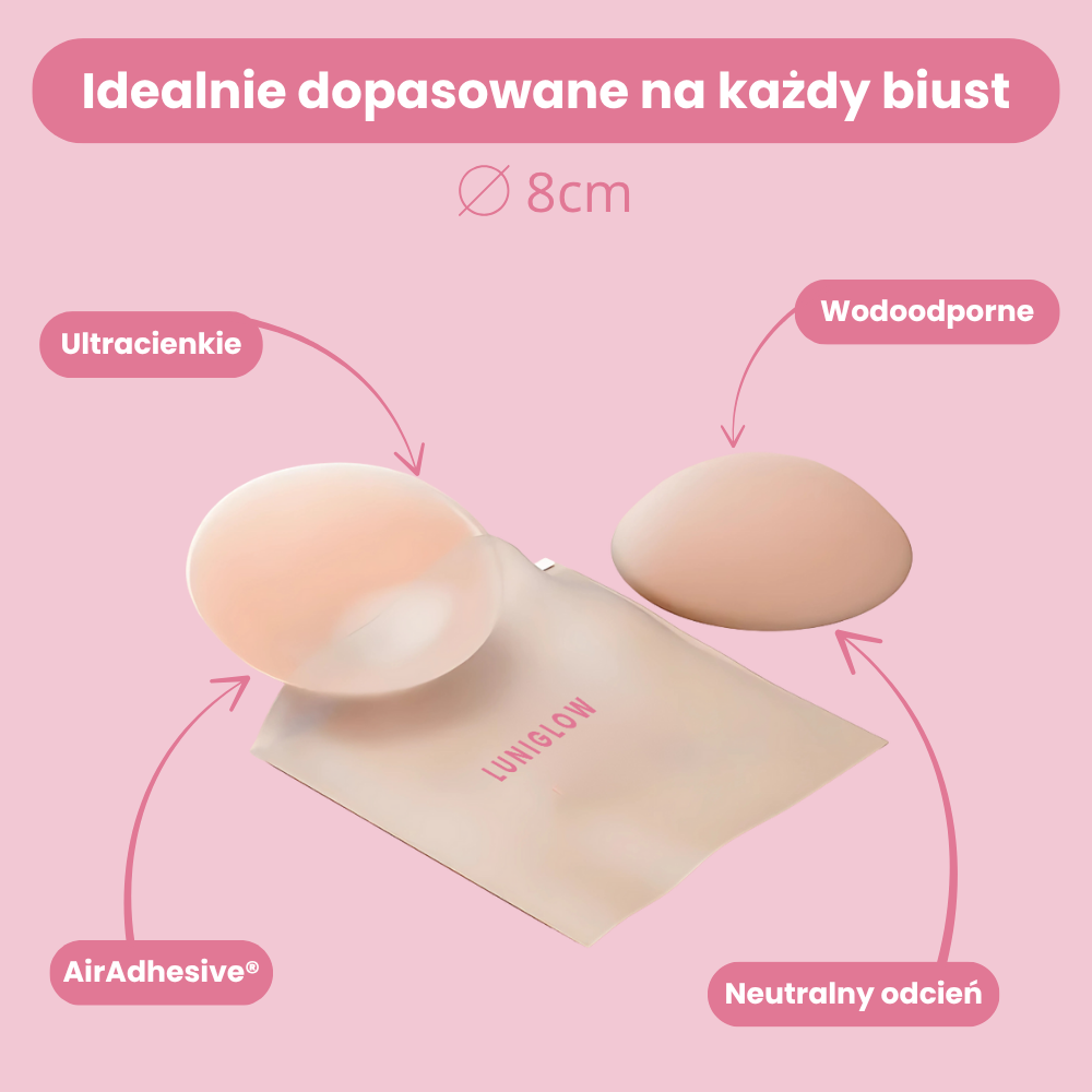 Dzięki latom pracy i autorskiej technologii, LuniGlow zapewnia najwyższą jakość, idealnie dopasowując się do kształtu każdej piersi od AA do DDD+, a kolor perfekcyjnie komponuje się z każdą karnacją.
